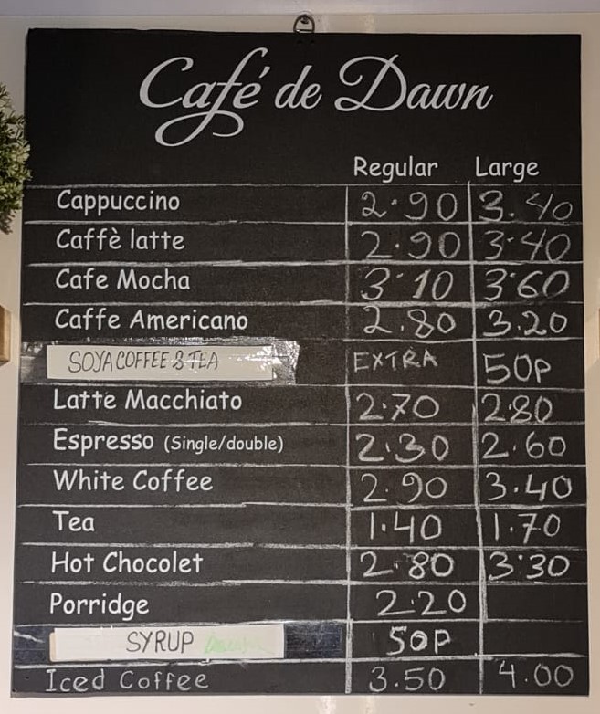 Welcome to Cafe' de Dawn, nestled conveniently near the Bluewater station in Greenhithe. This charming café is a haven for coffee aficionados and casual drinkers alike. The menu is a delightful fusion of classic and contemporary coffee options, with special attention to diverse milk choices, ensuring everyone finds their perfect cup.